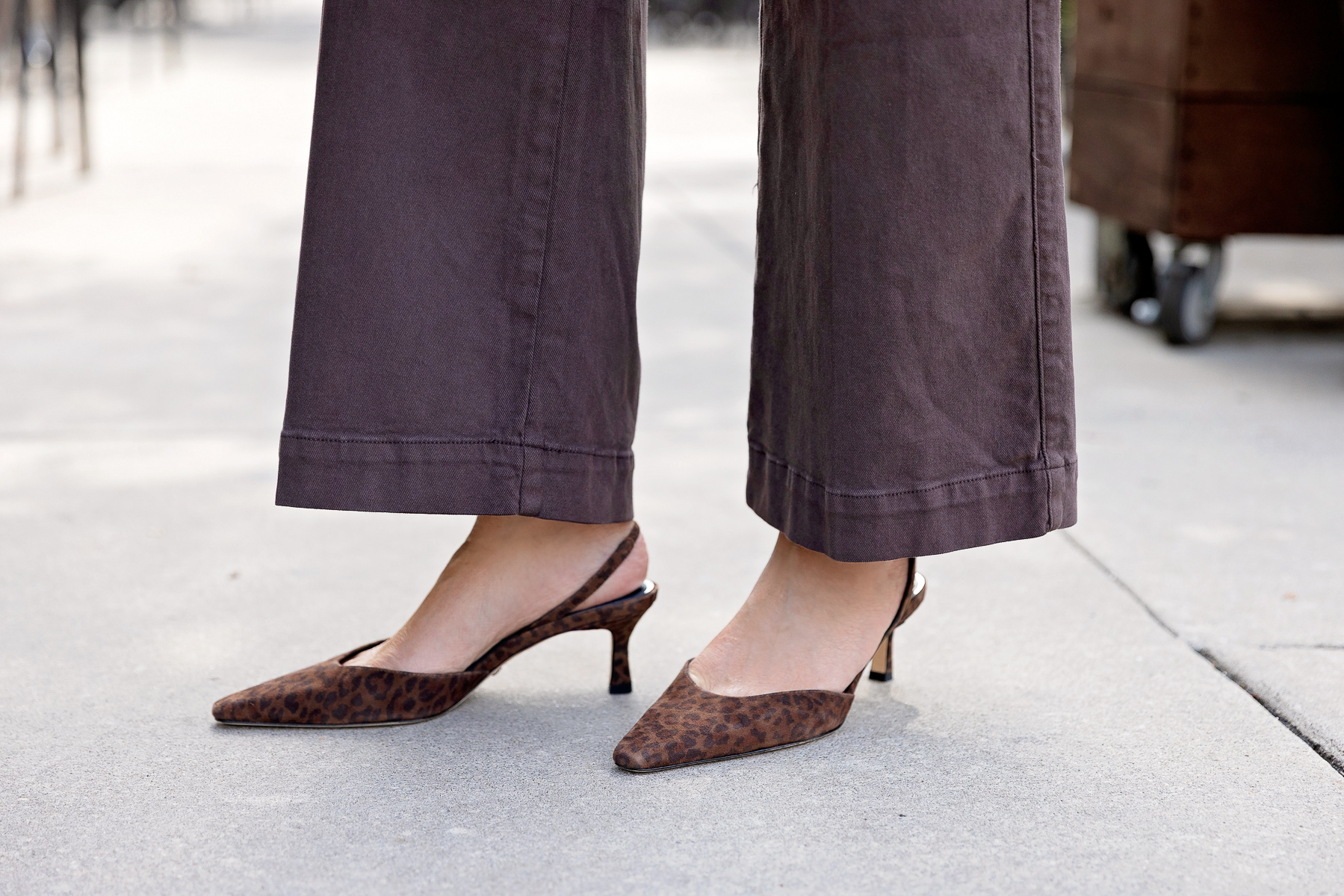 Once I wish to take the PAIGE Anessa utility pants even additional into fall, I’ll swap out the sandals for these leopard slingback pumps.