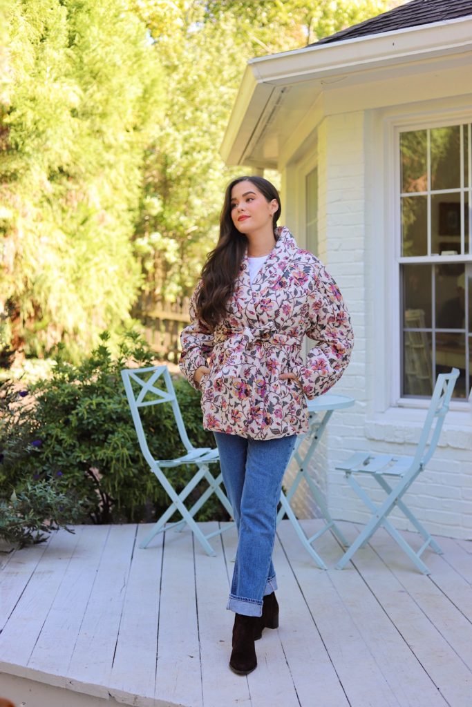 I’ve been a giant fan of quilted jackets for fall. And this floral one is just too cute to go up for the season forward. I really like the wrap waist for added form.