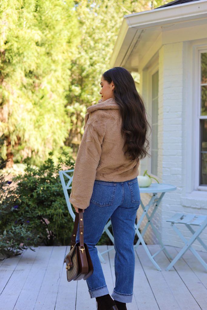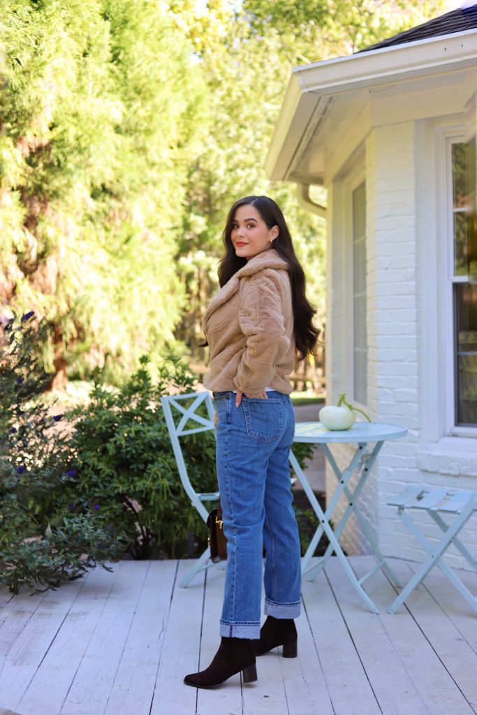 I really like a fake fur jacket for fall and winter. This beige jacket immediately elevates an outfit and ideal for date night time or throwing on over a sweater costume like this.