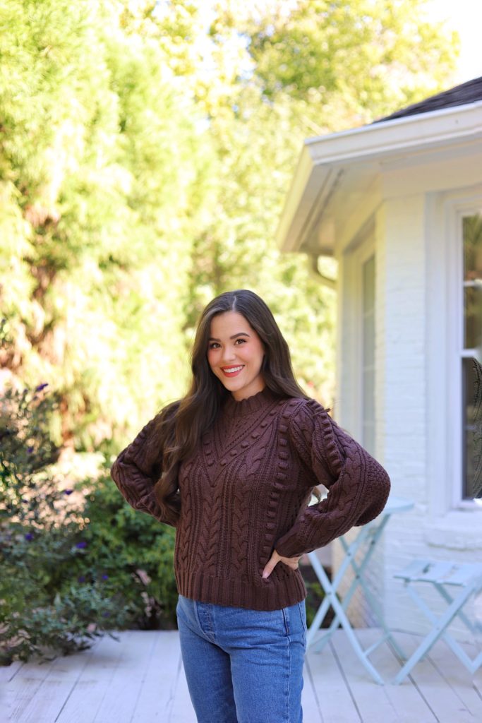 One coloration I’ve been loving for fall is that this wealthy brown shade. This stunning cable-knit/popcorn sweater is ideal for dressing up or down this fall.