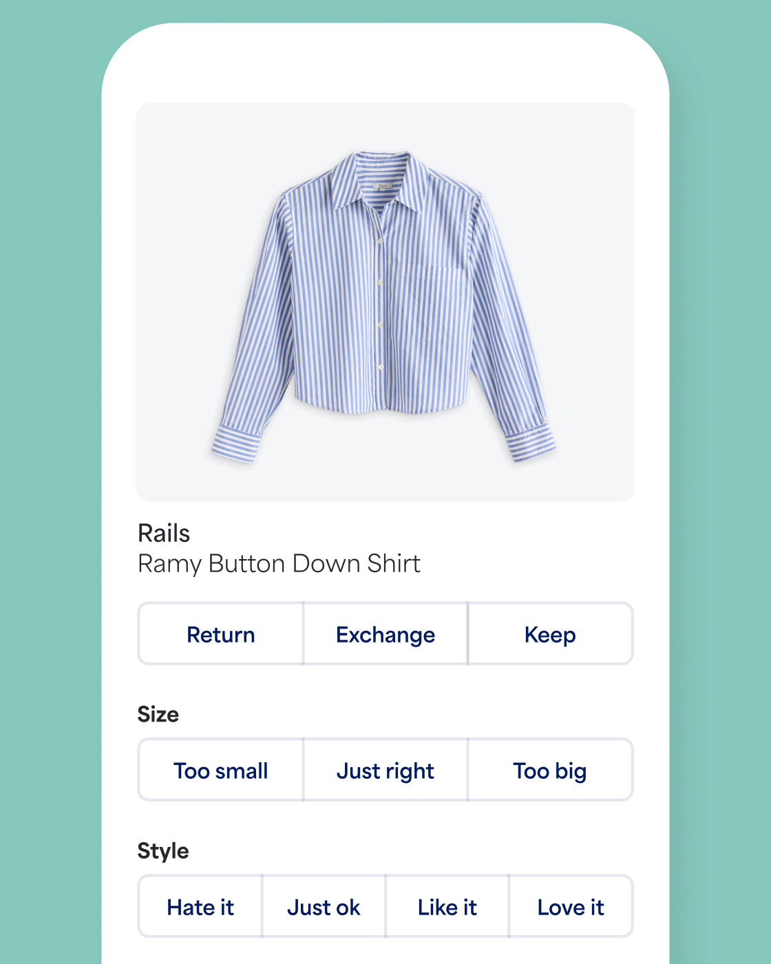 This fast, enjoyable device exhibits you outfits and items to price with a thumbs-up or down. Behind the scenes, your swipes assist your Stylist perceive your preferences with extra depth and nuance than the type quiz alone.