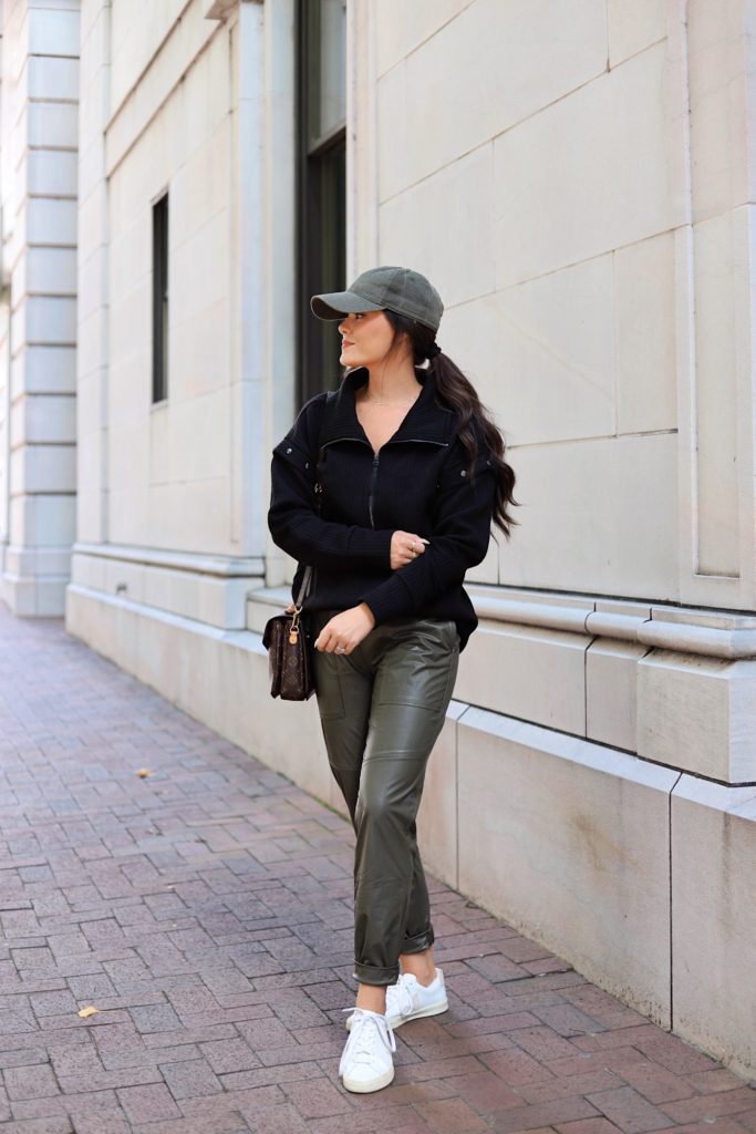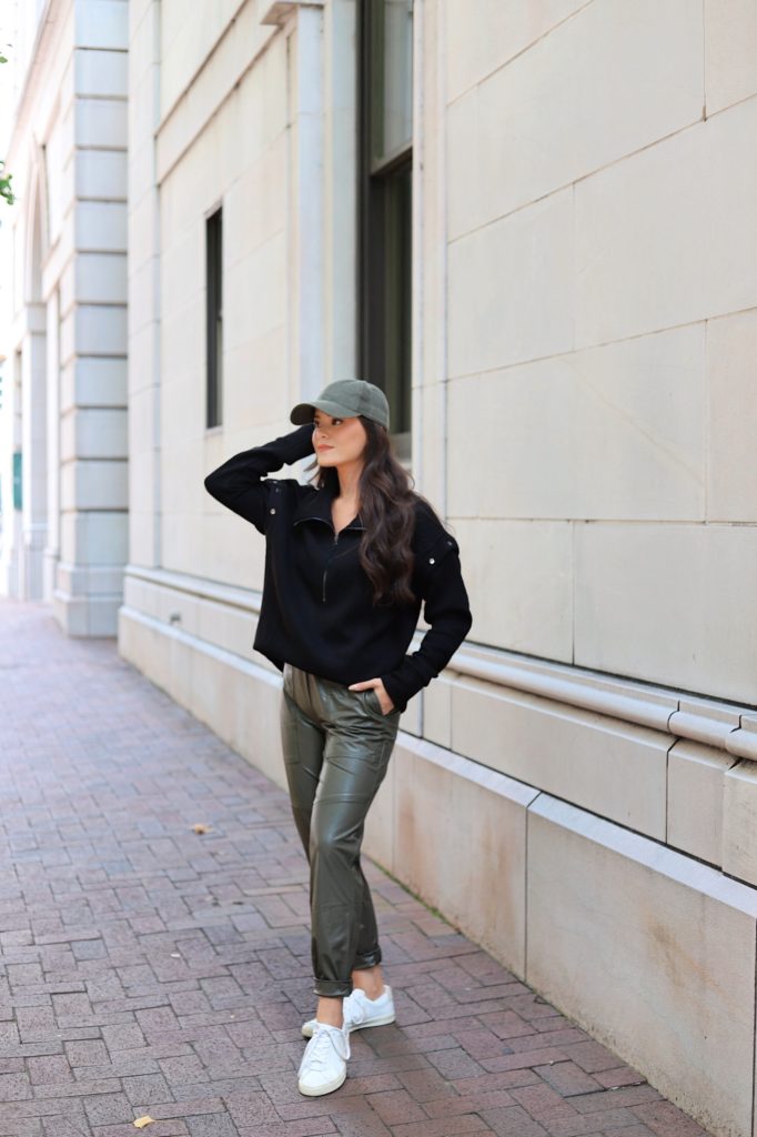 At first look, these inexperienced fake leather-based joggers is usually a little bit “edgy.” However paired with the precise items, you may costume them up or down and have a whole lot of enjoyable styling them this season! These joggers are so comfy and the standard is wonderful! They’d be good to raise an athleisure seem like I’ve styled right here with this sweatshirt and sneakers. However they’d even be good to journey in!