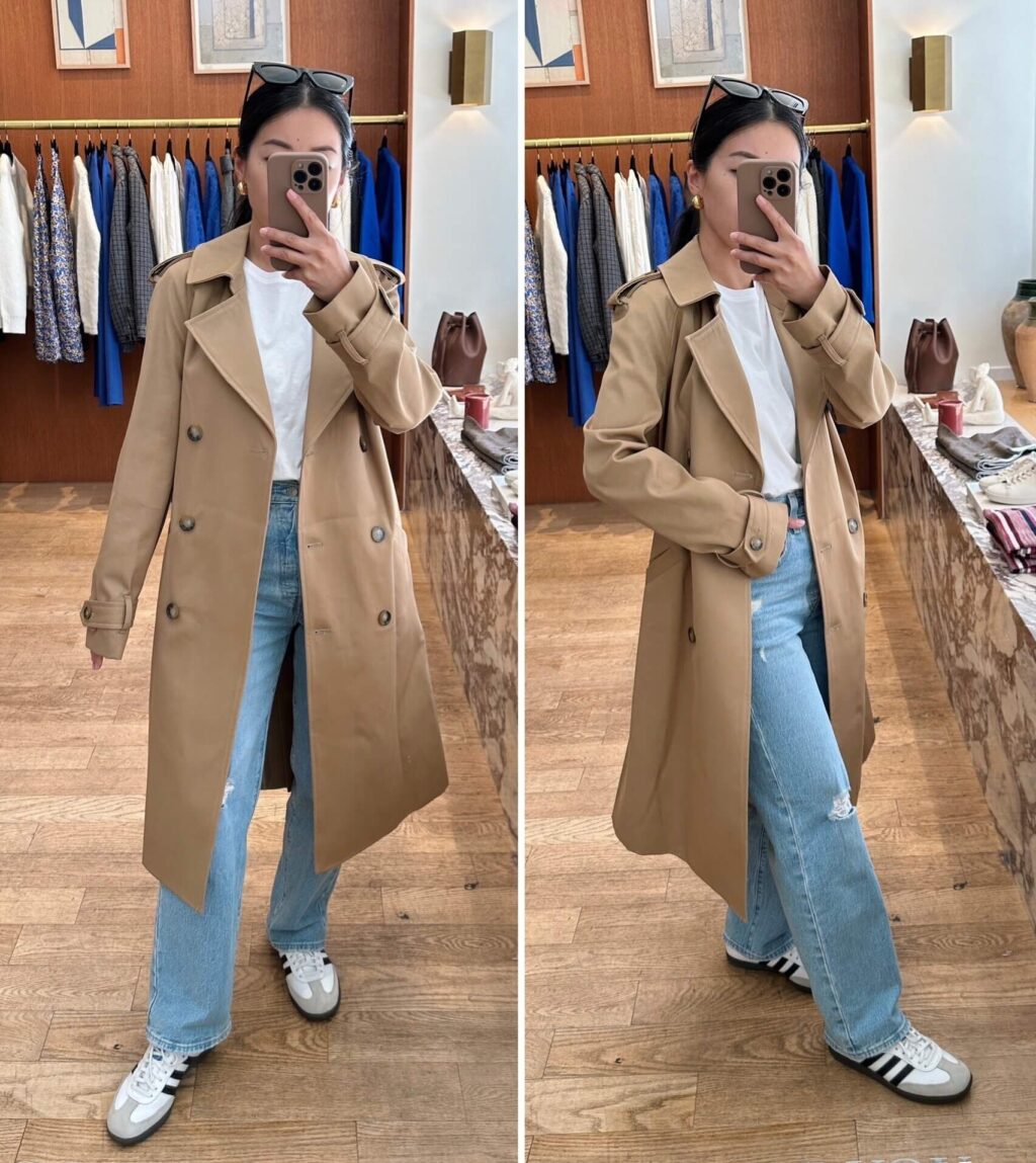 I’ve been reaching for my outsized drape Oak + Fort trench a ton (20% off utilized in cart for Labor Day), however for a extra conventional tailor-made trench that’s extra purposeful for damp climate, the Sézane Scott trench is a well-liked one yearly. The fabric is a sturdy weight, structured cotton material and is evenly coated to be water-repellant.