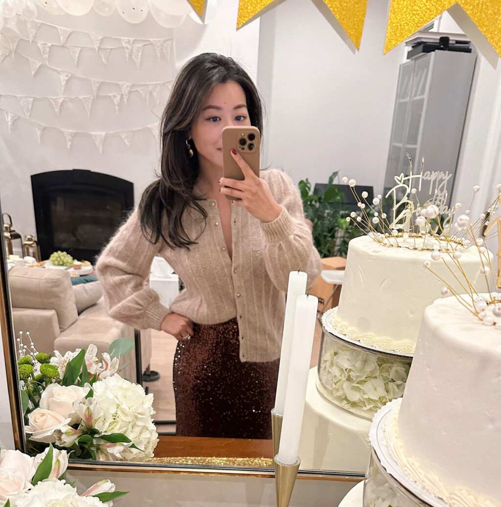 I’ve misplaced rely of the variety of methods I’ve worn this cardigan. I’ve proven it earlier than over straight Levis denims, with a mini, and for the vacations I beloved it for cozy glam seems to be over a sequin or satin midi skirt!