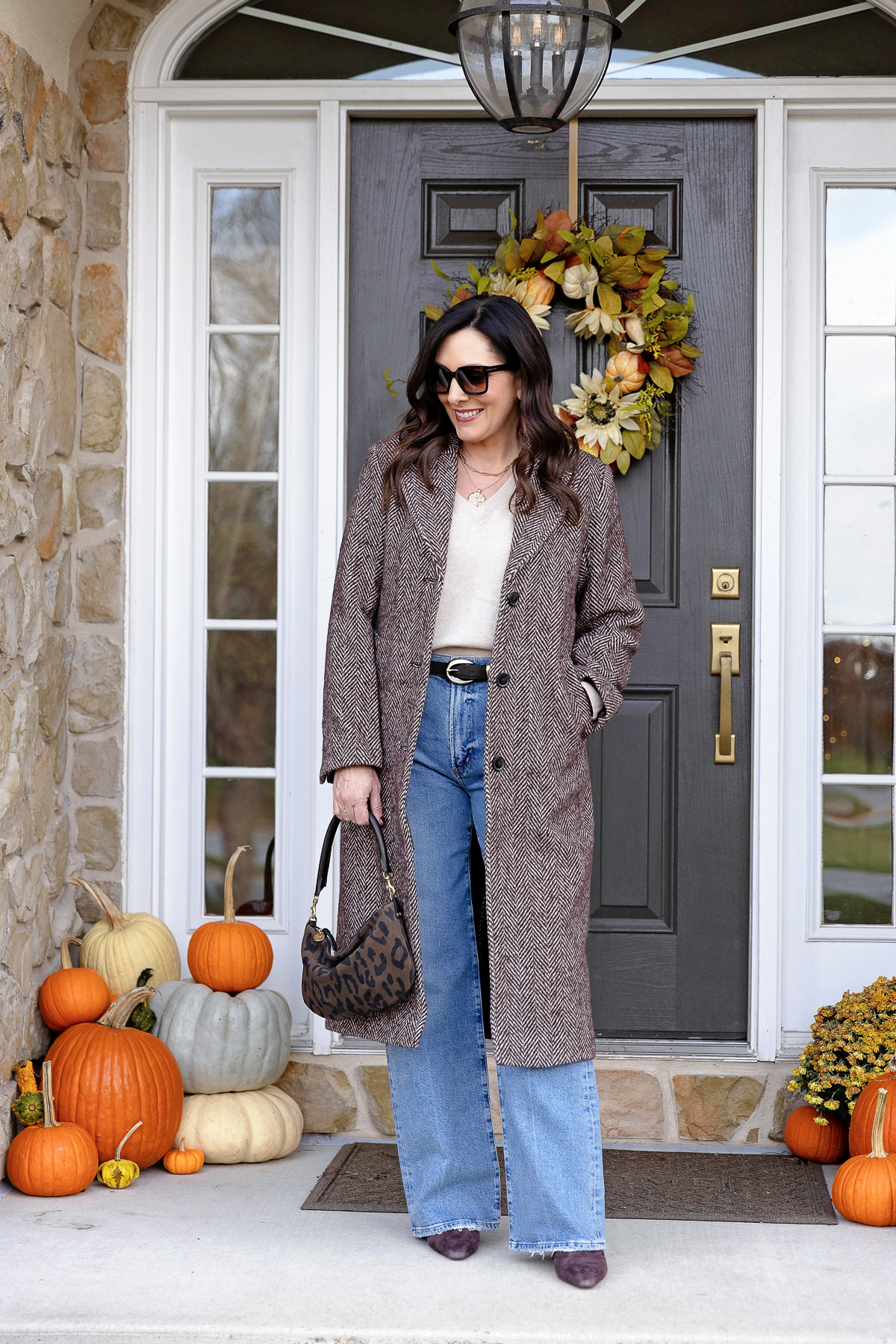 Right here’s the identical boot-and-denim combo with a extra traditional pairing: an oatmeal v-neck sweater and an extended brown herringbone coat. That is a type of timeless fall/winter outfits that at all times seems to be pulled collectively.