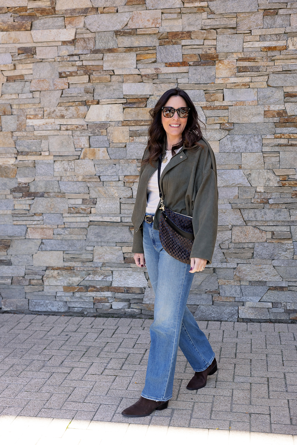 AG Brinley Straight (29) // Dolce Vita Faint H2O Waterproof Chelsea Boot in Darkish Brown Suede (8.5) // bubble hem bomber jacket in Military Inexperienced (S) // LNA Harrison Tee in Heather Oat (M) // Treasure & Bond suede belt in Chocolate (M) // Clare V. Moyen Messenger