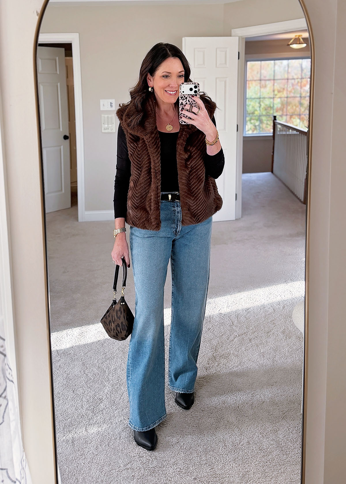 AGOLDE Harper (30) // Dolce Vita Vaydin Bootie (8.5) // Avec Les Filles Fake Fur Vest (S) // LOFT Scoop Neck Tee (M) // Treasure & Bond belt in Chocolate (M) // Clare V. Petit Moyen Messenger // Jane Win pendant
