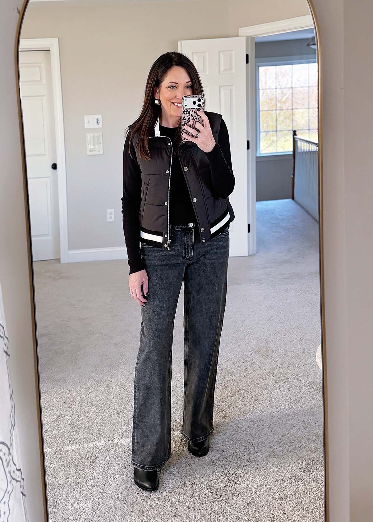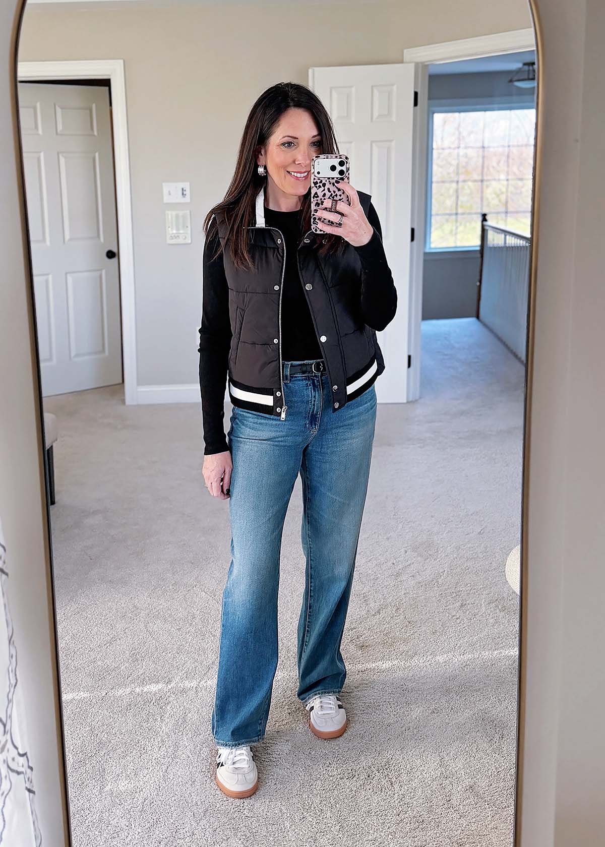 I additionally just like the AG Brinley (on sale at Nordstrom) with my adidas Spezials, and as you may see, this vest-and-tee combo works simply as properly with blue denims and sneakers because it does with washed black denim and informal black boots (proven above). It’s an excellent instance of how swapping the shoe can fully change the vibe whereas the outfit system stays the identical.