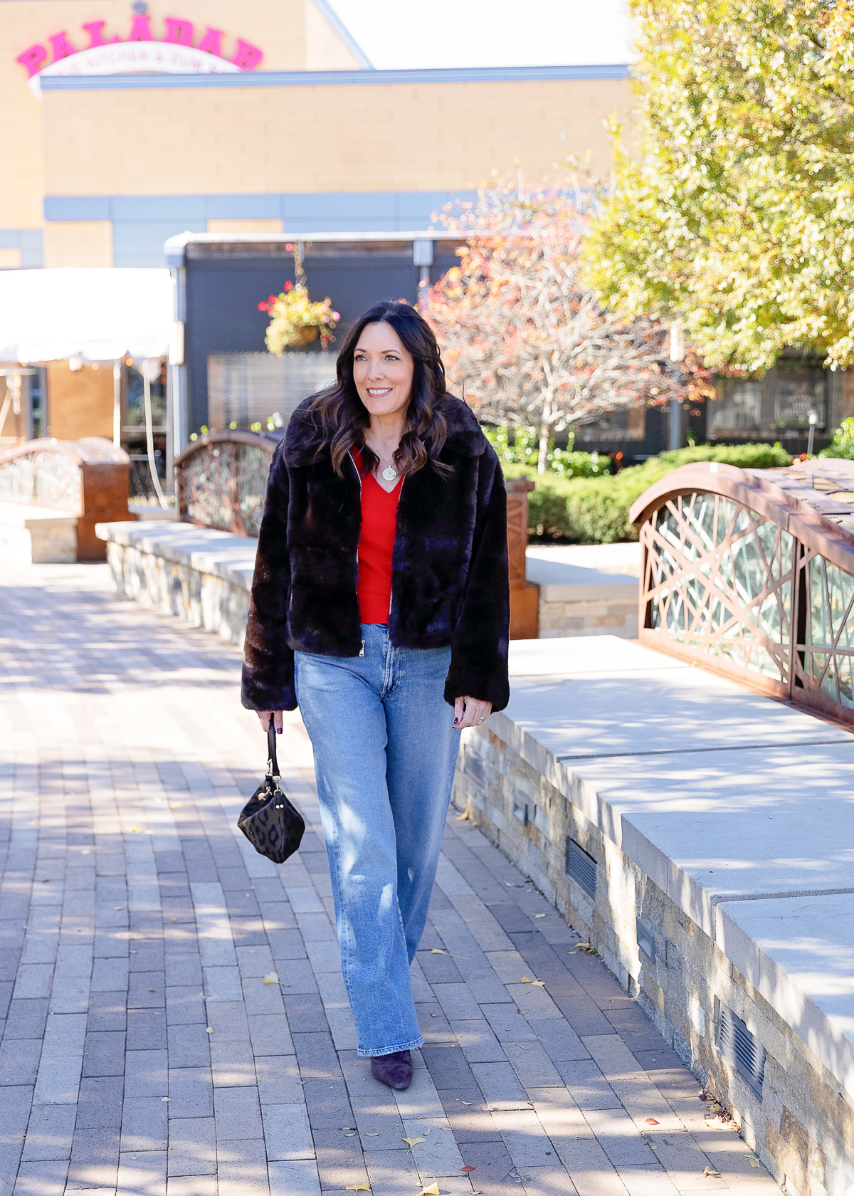 I styled them right here with the AGOLDE Harper Straight, a daring purple v-neck sweater, and a pretend fur jacket.