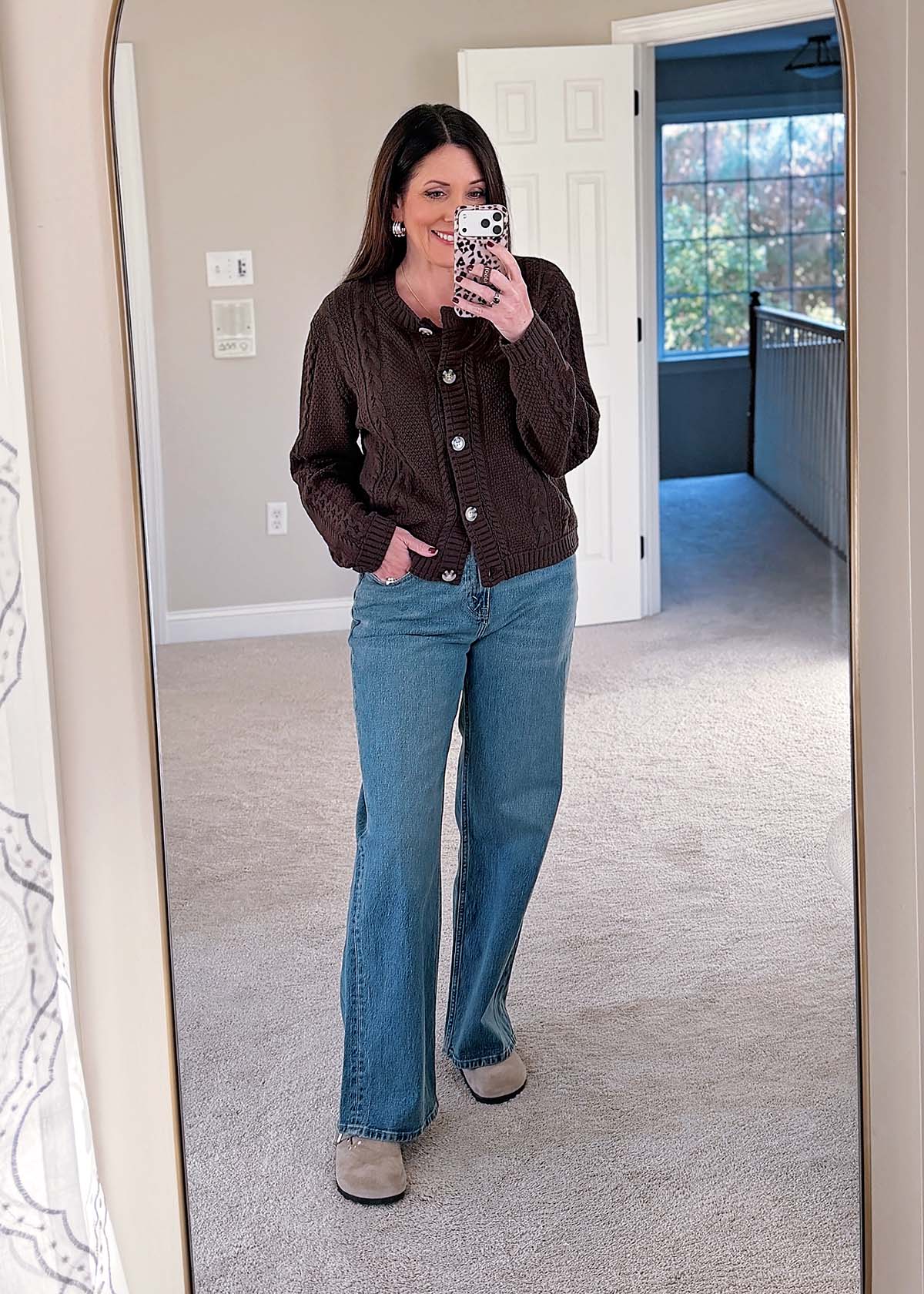 And right here’s an identical look, the place I swapped out the sweatshirt for a chunky cardigan, and these are the Abercrombie Excessive Rise 90s Relaxed Denims. I’m sporting the dimensions 30, they usually had been somewhat massive. I feel the 29 could be a greater match, however this brief size is ideal for me with flats.