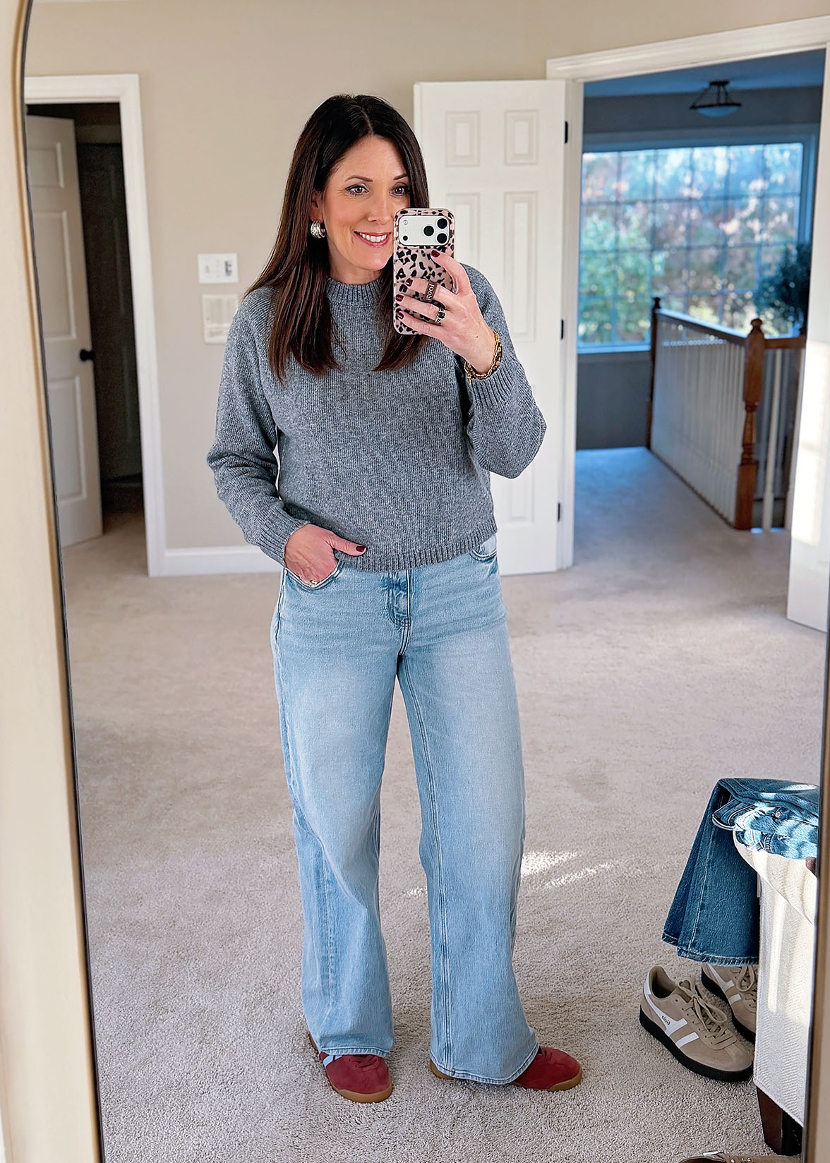 The Quince Bella Relaxed Straight pairs completely with these low-profile Gola sneakers in shades of blue and burgundy. I saved the look streamlined with a easy blue pullover sweater so the colours tie collectively with out feeling overly coordinated. It’s a simple, on a regular basis outfit that feels sporty however nonetheless put-together.