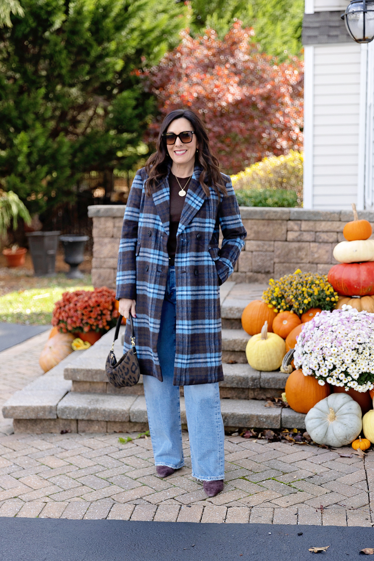 I additionally love this look with a chocolate brown crewneck sweater and a daring blue-and-brown plaid coat.